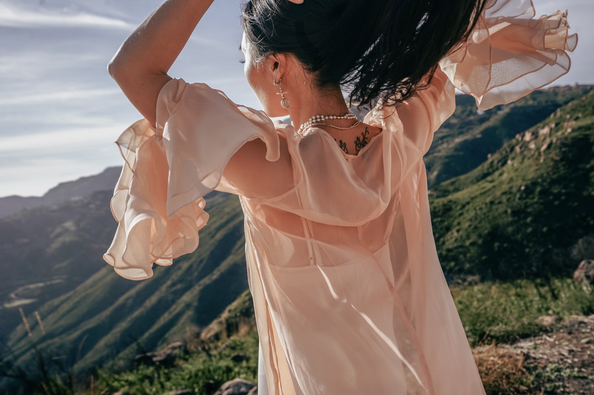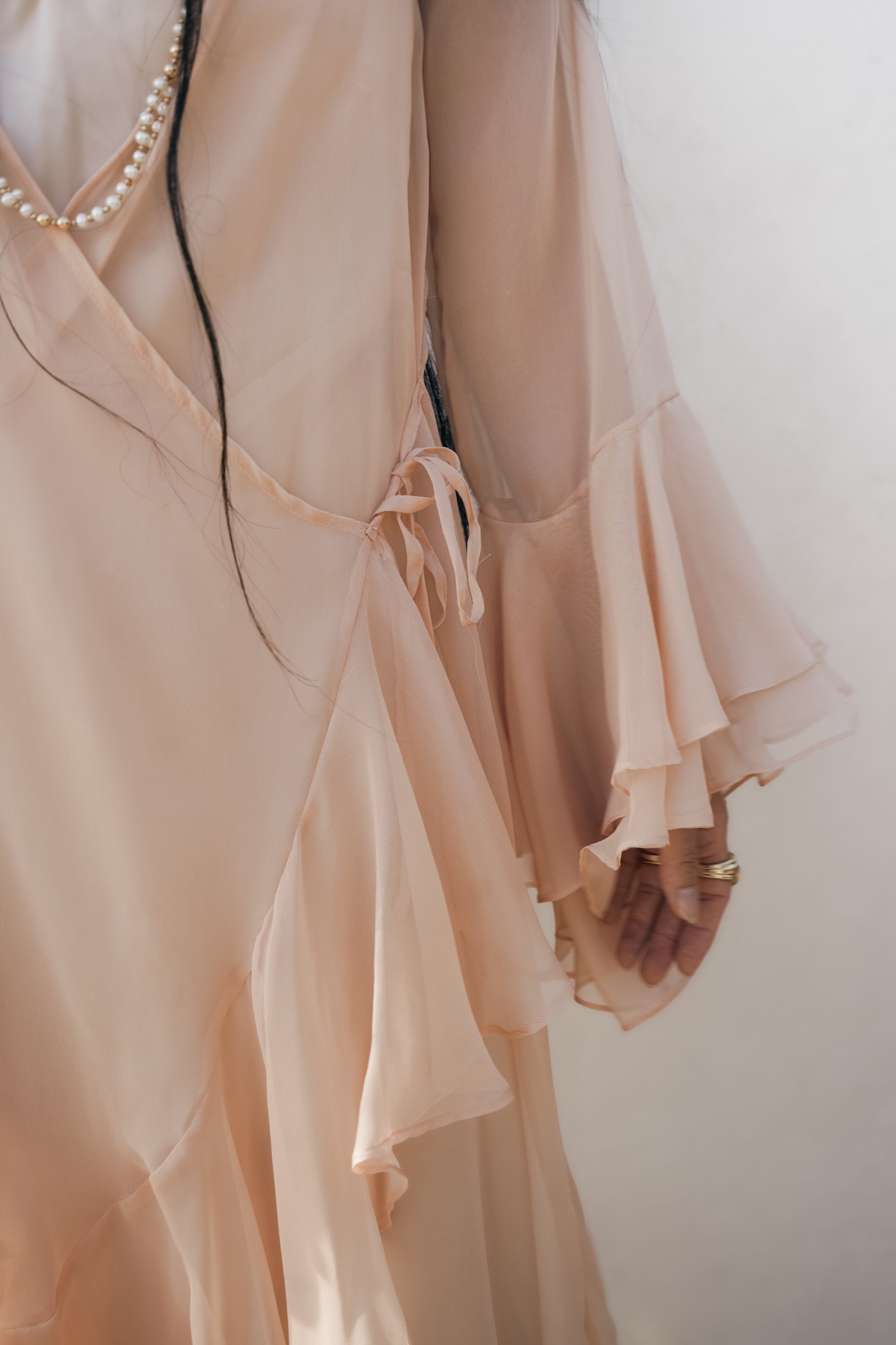 Silk wrap overlay robe with double ruffle sleeves and single ruffle hem.