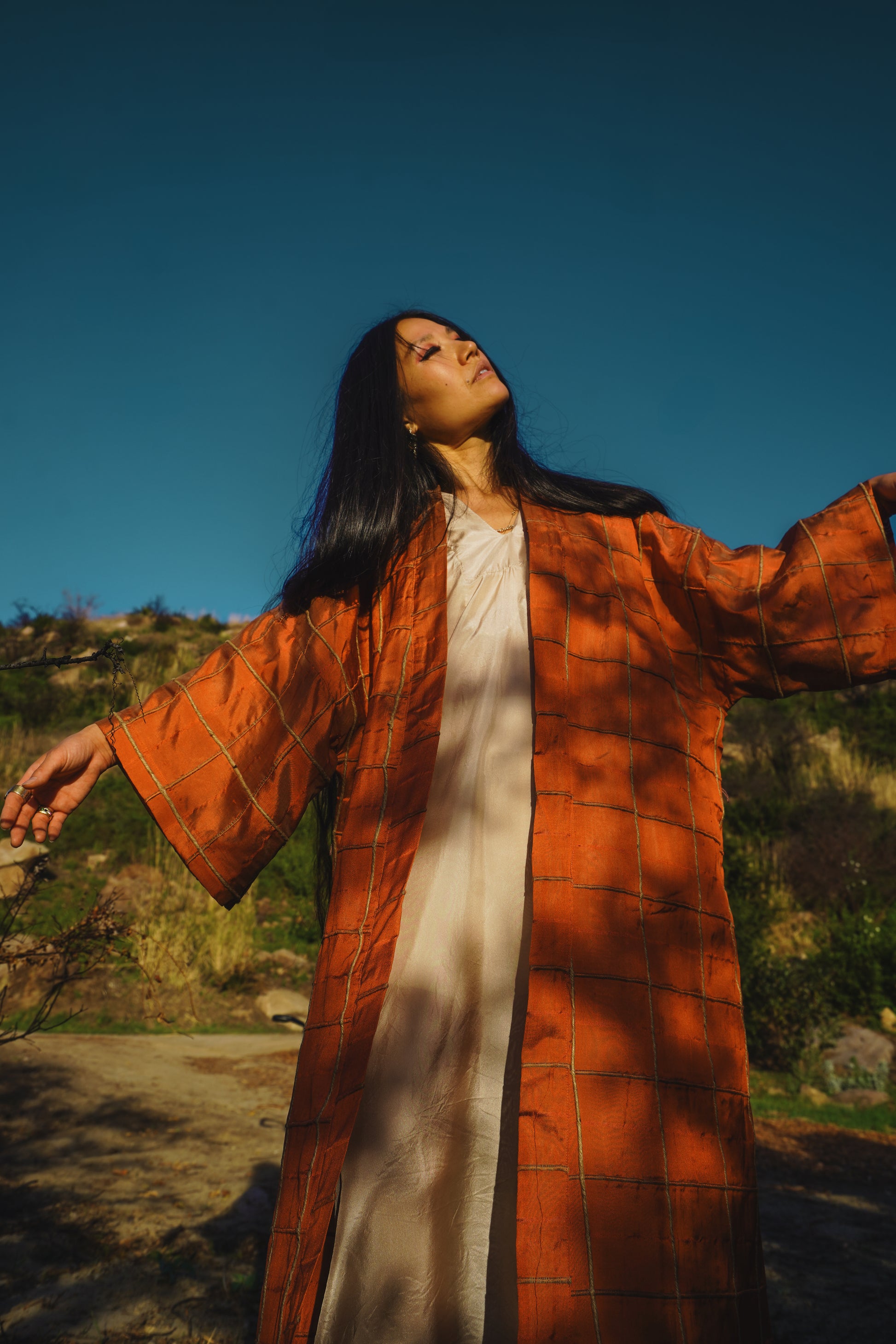 Dusty orange silk with Jute weaving detail.